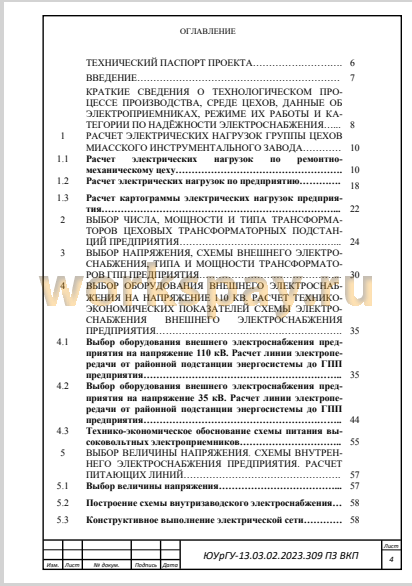 Были определены расчетные мощности предприятия. Выбрана система внешнего электроснабжения на основе технико-экономического расчета. Спроектирована система внутреннего электроснабжения предприятия. Выбрано электрооборудование системы электроснабжения, в том числе комплектные конденсаторные установки для компенсации реактивной мощности. Рассчитаны показатели качества на шинах ГПП. В разделе релейная защита произведен расчет секционного выключателя с необходимыми пояснениями и схемами. Рассмотрен вопрос безопасность и жизнедеятельность. В прилагаемой графической части изображен план завода с нанесенной на него картограммой нагрузок, кабельной разводкой внутреннего электроснабжения и цеховыми ТП.