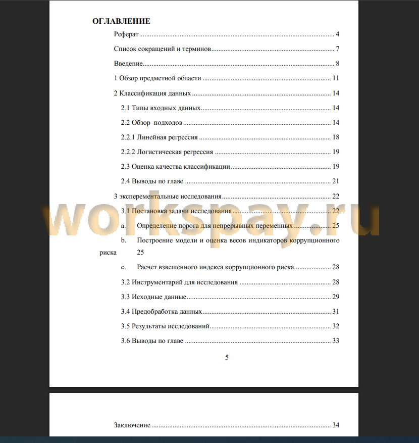 Основная часть магистерской диссертации состоит из трех разделов: в первом разделе рассматривается обзор существующих методов оценки коррупционных рисков; во втором разделе располагается обзор основных подходов и алгоритмов регрессионного анализа; в третьем разделе описываются экспериментальные исследования, проведенные с целью оценки эффективности предлагаемых подходов для расчета Взвешенного индекса коррупционного риска (ВИКР).