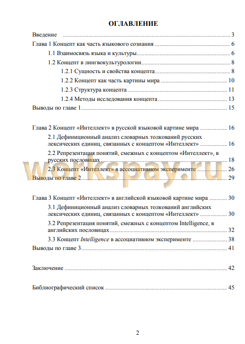 Дипломная работа состоит из введения, трех глав, заключения и списка использованной литературы. Во введении дается обоснование актуальности и выбора темы исследования, определяются объект, предмет, цель, задачи и методы исследования, а также его научная новизна, теоретическая и практическая значимость. Первая глава состоит из двух частей и посвящена связи между языком и культурой и рассмотрению сущности, структуры и методов исследования концепта. Вторая глава посвящена анализу русского лексического и паремиологического материала, связанного с концептом «Интеллект», в русском языке, а также интерпретации результатов ассоциативного эксперимента, проведенного с русскими респондентами. Третья глава посвящена анализу английского лексического и паремиологического материала, связанного с концептом «Интеллект», в английском языке, интерпретации результатов ассоциативного эксперимента, проведенного с англоязычными респондентами, а также нахождению сходств и различий в роли данного концепта в двух лингвокультурах. В заключении подводятся основные итоги проведенного исследования, формулируются общие выводы.
