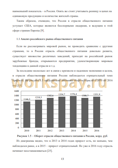 Можно сделать вывод о том, что рынок общественного питания динамично развивается, влияние экономического кризиса сказывается на данной индустрии, но значительно слабее, чем в других отраслях. Специалисты считают, что потребность в точках общественного питания пока еще не удовлетворена. Несмотря на кажущееся изобилие говорить о насыщении рынка рано. Некоторые возможности рынка используются не в полную силу, поэтому совершенно точно можно утверждать о высокой активности роста отрасли в будущем [4]. Процветание рынка потребительских услуг и рынка общественного питания можно однозначно отнести к социально значимым задачам, поскольку развитый сектор услуг констатирует развитость экономической системы в целом, ну а в микромасштабе пища является основой жизни человека. От того, как человек питается, зависит его здоровье, настроение, трудоспособность. Следовательно, питание человека-это не только его личное, но и общественное дело. Развитие отрасли общественного питания является крайне важной областью общего социально-экономического развития региона и экономики страны в целом.