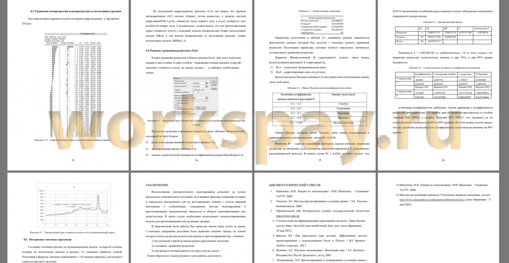 В практической части работы был проведен анализ цены золота за грамм. С помощью диаграммы рассеяния было выявлено наличие тренда, на основе которого были построены модели для анализа и прогнозирования цен, а именно: