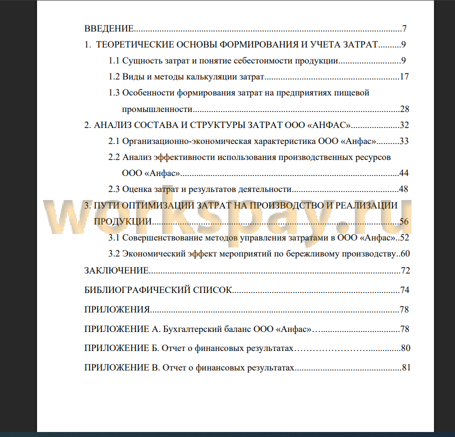 Во введении обоснована актуальность выбранной темы, определена цель, поставлены задачи. В первой главе рассмотрены теоретические основы формирования и учета затрат. Во второй главе дипломной работы проведен анализ структуры затрат на производство и реализацию продукции ООО «Анфас». В третьей главе выпускной квалификационной работы определены проблемы управления затратами на предприятии и намечены пути их решения. В заключении сделаны выводы по проделанной работе.
