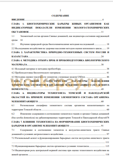 Во введении указаны актуальность исследований, определены цель и задачи, показаны основные результаты, представлена их научная новизна и практическая значимость, а также обозначен личный вклад автора и апробация работы. В первой главе рассматриваются особенности функционирования биогеохимических барьеров живого организма, и исключительная роль элементного состава органов Свиньи домашней (Sus scrofa domesticus) как индикатора геоэкологических обстановок. Во второй главе рассматриваются способы анализа экологического состояния окружающей среды, изучение природной среды биогеохимическими методами исследований и методом оценки жизненного цикла. В третьей главе приводится краткое геотектоническое литологическое и металлогеническое описание и геоэкологическая характеристика районов исследования. В четвертой главе описываются методика проведения исследований, способы отбора проб, их последующей подготовке, методах анализа, приемах математической обработки данных, а также методических основах модели USEtox. Пятая глава посвящена статистическим параметрам накопления элементов в организме Свиньи домашней, рассчитаны средние содержания, рассчитаны коэффициенты корреляции и вариации элементов во всей изученной выборке. В шестой главе рассматриваются основные индикаторы техногенеза. Проведен сравнительный анализ содержания химических элементов в пробах органов и тканей млекопитающих, отобранных на территории Томского района, Забайкальского края и Павлодарской области. В седьмой главе описываются особенности распределения и концентрирования элементов в барьерных системах органов. Восьмая глава посвящена применению модели USEtox при оценке токсичности элементов для здоровья населения, а также методике расчетов характеристического коэффициента токсичности с использованием локальных данных, как на уровне регионов (исследованные в работе области), так и на уровне стран (собственные расчеты и литературные данные. В заключении рассматриваются основные результаты и выводы по диссертационной работе.
