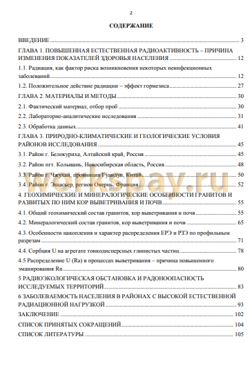 Глава 1 посвящена вопросам влияния естественной радиоактивности и малых доз радиации на организм человека. Рассмотрены как негативные последствия, так и положительное действие радиации. Глава 2 включает описание материалов и методов исследования: отбор проб, лабораторноаналитические исследования и статистическую обработку данных. Глава 3 характеризует природно-климатические и геологические условия районов исследования. В главе 4 описаны общие геохимические и минералогические особенности гранитов и развитых по ним кор выветривания и почв, а также особенности накопления и характер распределения Th и U по профильным разрезам. Рассмотрен вопрос распределения ЕРЭ по гранулометрическим фракциям кор выветривания и почв. Определены формы нахождения радионуклидов в процессах выветривания гранитов. Глава 5 отражает радиоэкологическую обстановку и вопросы радоноопасности исследуемых территорий. Глава 6 содержит анализ показателей заболеваемости населения ВПР, ЗНО и анемиями в районах с высокой естественной радиационной нагрузкой. В заключении представлены основные выводы по работе.