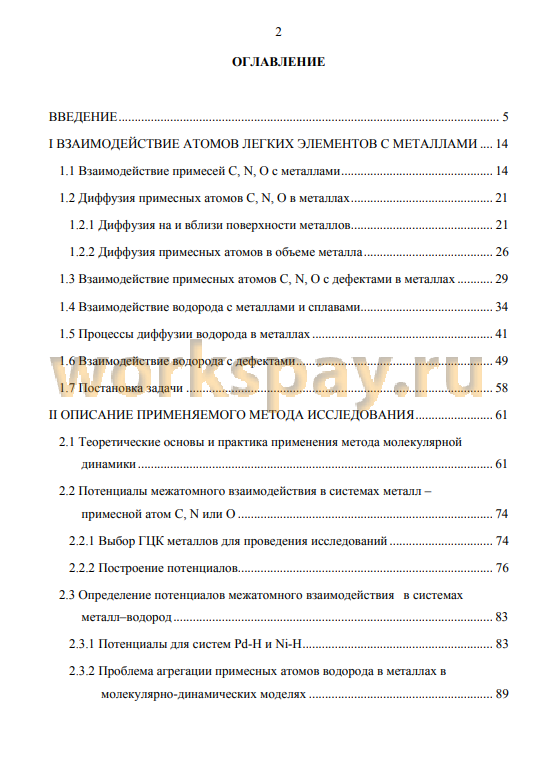 Диссертация состоит из введения, семи глав и заключения. В первой главе диссертации дается общий обзор экспериментальных и теоретических данных по теме взаимодействия примесных атомов легких элементов с металлами. Рассматривается влияние примесей на свойства металлов, современные представления о диффузии примесных атомов в металлах, взаимодействие примесей с различными дефектами кристаллической структуры. Первая часть главы посвящена примесям углерода, азота и кислорода, вторая часть - водороду. В конце первой главы сделана постановка задачи.