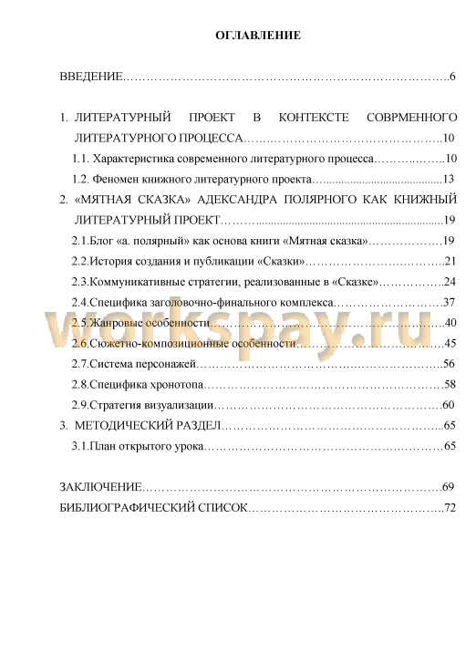 Структура работы. Работа состоит из введения, трёх глав, заключения, библиографического списка. Общий объём работы — 80 страниц. Библиографический список содержит 85 наименований. В первой главе приводится краткий обзор современного литературного процесса, рассматривается феномен «книжный литературный проект», даётся анализ научных работ, посвящённых характеристике современного литературного процесса, исследованиям сетевой литературы и литературных проектов. Во второй главе мы рассматриваем особенности творчества Александра Полярного в контексте современной культуры, анализируем «Мятную сказку» как литературный проект. Третья глава содержит методическое описание урока по исследуемой теме.