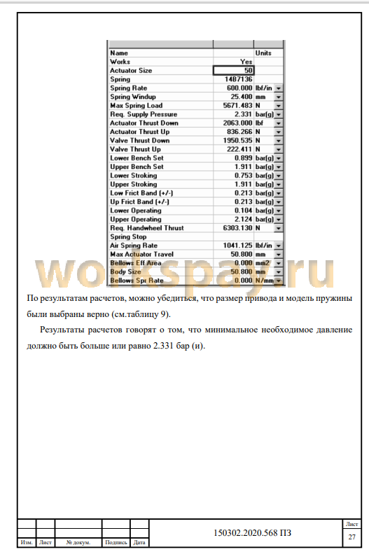 расчеты в программном пакете Fisher 2.0. В ходе расчетов был выбран регулирующий клапан Fisher ET клеточного типа с линейным движением штока и равнопроцентной пропускной характеристикой. В дополнении, были определены усилия, действующие на плунжер, и выбрана пружина 14В7136Х012. Кроме того, определен размер привода равным 50. Для подтверждения корректности данных расчетов параметры пневматического привода были определены также в программном пакете Fisher 2.0. и, следовательно, размер привода и модель пружины были выбраны верно. Следующим шагом осуществлялся подбор цифрового позиционера DVC6200 и фильтра-регулятора Fisher 67CFR, а также компрессор по параметрам необходимой подачи и давления.