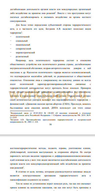 Вместе с тем современное уголовное законотворчество в ряде случаев создает условия для излишней конкуренции норм, что в свою очередь способно дезориентировать правоприменителя в выборе приоритетности уголовно- правовых средств. Так, Постановлением Пленума Верховного Суда РФ от 09.02.2012 № 1 «О некоторых вопросах судебной практики по уголовным делам о преступлениях террористической направленности» и Федеральным законом от 06.03.2006 № 35-ФЗ (ред. от 31.12.2014) «О противодействии терроризму», были внесены существенные изменения в ст. 205 УК РФ. Большинство этих новаций, безусловно, следует оценить положительно. Однако мы считаем необходимым особое внимание уделить положениям, которые являются спорными, и, как правило, создают затруднения при квалификации деяния.