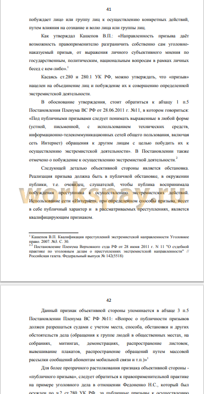Что касается проблем, связанных с квалификацией ряда экстремистских преступлений по субъективным признакам составов, то здесь следует обратить внимание на то, что деяние, предусмотренное ст. 282 УК РФ, с субъективной стороны, характеризуется специальной целью - возбуждение ненависти или вражды по отношению к отдельным лицам или группе лиц. Наличие указанной цели является обязательным, поскольку в противном случае исключается квалификация деяния как преступного по анализируемому составу преступления. Исходя из обозначенного подхода, не образуют состав уголовно наказуемого по ст. 282 УК РФ деяния высказывание мнений, с использованием информации о любых социальных отношениях в дискуссиях, а также соответствующих научных текстах, которые не преследуют цели возбуждения ненависти либо вражды, а равно унижения достоинства кого-либо.
