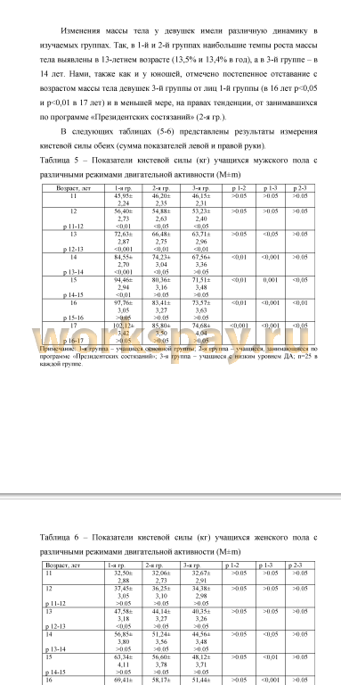 Показатели физического развития учащихся соответствуют возрастным стандартам у лиц с высоким и средним уровнем двигательной активности, при низком уровне двигательной активности отмечается отставание показателя массы тела от нормативного. У юношей выявлено два «скачка роста» показателя длины тела в 13 и 15 лет. Наибольшие величины физиометрических показателей отмечаются у лиц с высоким уровнем двигательной активности.