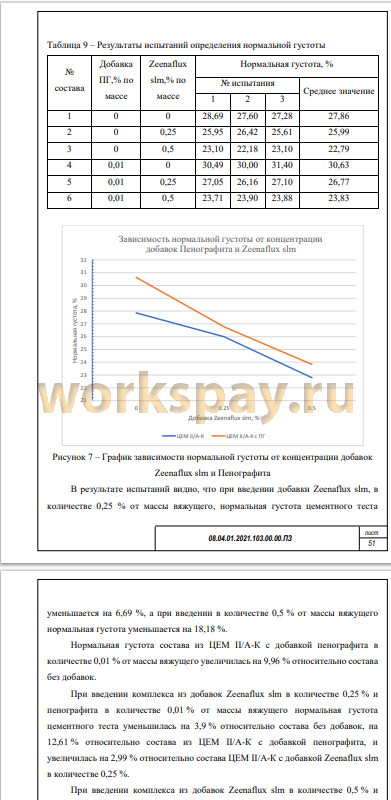 Исследуемый мной цемент ЦЕМ II/А-К является композиционным цементом имеет в своём составе 88 % ЦЕМ I, 6 % доменного гранулированного шлака и 6 % микрокремнезема. Проведены исследования свойств цемента по ГОСТ 310.1-76, ГОСТ 310.2-76, ГОСТ 310.3-76, ГОСТ 310.4-81, ГОСТ 310.5-88, ГОСТ 310.6-85, выполнена дерифатография образцом цементного камня. Также выполнены работы по исследованию влияния на цемент добавки нанодисперсного графита в количестве 0,01 % и добавки пластификатора Зенаплюс Китай в количестве 0 %, 0,25 % и 0,5 % от массы цемента.