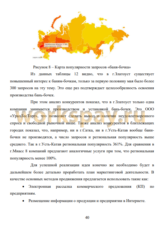 При этом анализ конкурентов показал, что в г.Златоуст только одна компания занимается производством и установкой бань-бочек. Это ООО «УралЛесТорг», что позволяет сделать вывод о наличии неудовлетворенного спроса и свободной рыночной нише. Также анализ конкурентов в близлежащих городах показал, что, например, ни в г.Сатка, ни в г.Усть-Катав вообще бани- бочки не производятся, а число запросов и региональная популярность выше среднего. Так в г.Усть-Катав региональная популярность 361%. Для сравнения в г.Миасс 8 компаний предлагают аналогичные услуги при том, что региональная популярность менее 100%.