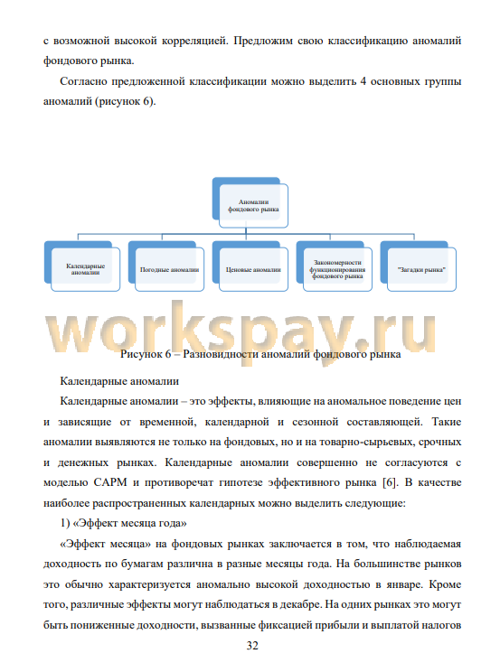 Далее было проведено сопоставление неоклассических и поведенческих финансов. В первую очередь была рассмотрена теория, являющаяся основой ведения финансовой деятельности в рамках неоклассической экономики - «Гипотеза эффективных рынков», ключевой постулат которой заключается в том, что в любой момент времени вся возможная информация является уже заложенной в цену бумаг. Следующим шагом стало рассмотрение выявленных аномалий. Было дано определение данного понятия, а также проведена классификация разновидностей аномалий фондового рынка. Так, можно выделить такие виды аномалий, как календарные, погодные, ценовые, закономерности функционирования фондового рынка, а также так называемые «загадки рынка».