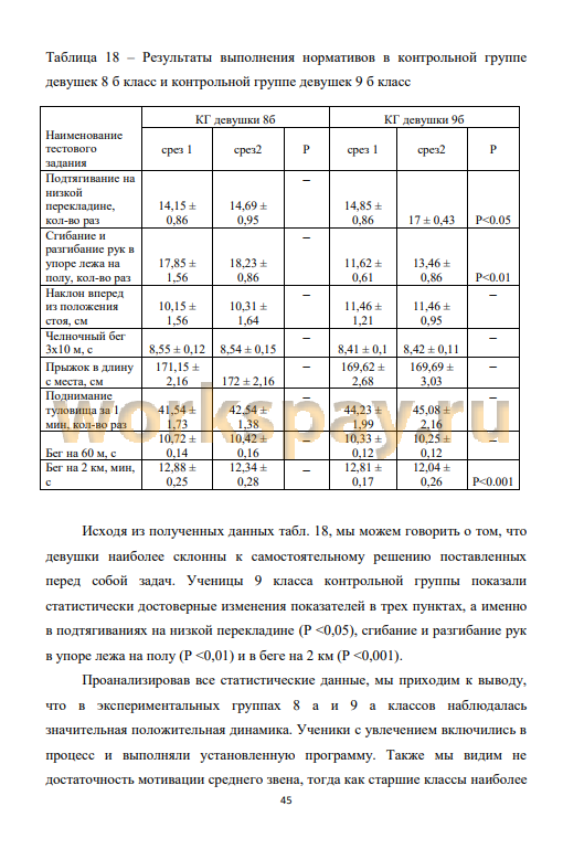 Проведя исследование результатов физической подготовки школьников с использованием 1 и 2 среза, и проведя расчеты с помощью математической статистики, пришли к выводу, что наибольшее количество достоверных результатов наблюдается в экспериментальных группах, это говорит о положительном влиянии разработанной методики усовершенствования программы по физической культуре ФГОС. Программа ФГОС без включения дополнительных методик не позволяет школьникам качественно подготовиться к выполнению норм ВФСК ГТО.