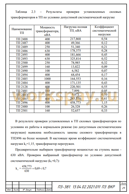 - определение процента загрузки существующих трансформаторов, при необходимости предусмотреть замену трансформаторов на более мощные;