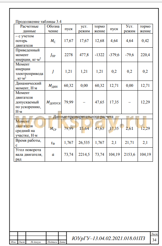 Следующим этапом было приведение статического и динамического сопротивления к валу двигателя. По полученным данным, были произведены дополнительные расчеты, на основании которых была проведена проверка двигателя по нагреву и производительности. Данные полученные в ходе проверки показали, что выбранный электродвигатель проходит как по нагреву, так и по производительности.