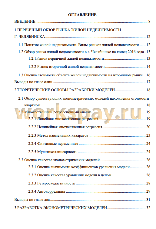Во второй главе приведена информация о существующих работах, посвященных эконометрическому моделированию рынка жилья, также приведены теоретические сведения об используемых эконометрических методах, применяющихся для моделирования стоимости жилья.