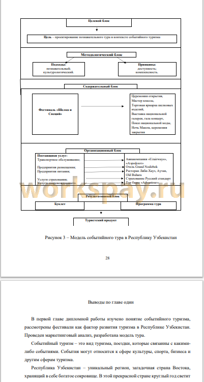 Таким образом, согласно теме исследования, был выбран для изучения и проектирования тура потенциал событийного туризма Республики Узбекистан как инструмента продвижения территории для внешних целевых аудиторий на примере текущего состояния рынка событийных мероприятий в Узбекистане и выявлено, что стране не хватает не только уникального турпродукта, но и грамотной политики продвижения событий для нерезидентов. Республика Узбекистан в настоящее время является одним из привлекательных направлений для туристов. В настоящий момент индустрия туризма в стране набирает все большие обороты, захватывает практически все виды туризма. В городах, наиболее привлекательных для туристов, проходит большое количество фестивалей и национальных праздников.