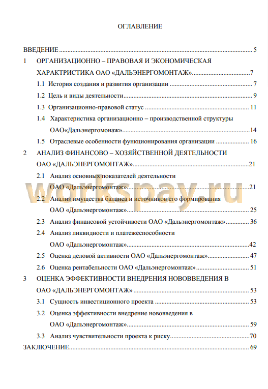 Структура выпускной квалификационной работы состоит из: титульного листа; задания на работу; аннотации; содержания; введения, в котором обосновывается актуальность темы исследования, определяются цель, задачи, предмет и объект исследования дипломного проекта; трех глав - в которых содержатся основные организационно-экономические данные по исследованному предприятию, также содержатся расчеты отдельных показателей в соответствии с оценкой финансового состояния конкретного предприятия, проводиться оценка эффективности предлагаемого нововведения для ОАО «Дальэнергомонтаж» в виде готового инвестиционного проекта; заключения, в котором делаются общие выводы о результатах проведенного исследования; библиографического списка, содержащего перечень используемых литературных источников; приложения, в котором представляется бухгалтерская отчетность ОАО «Дальэнергомонтаж» за 2013-2О15гг.