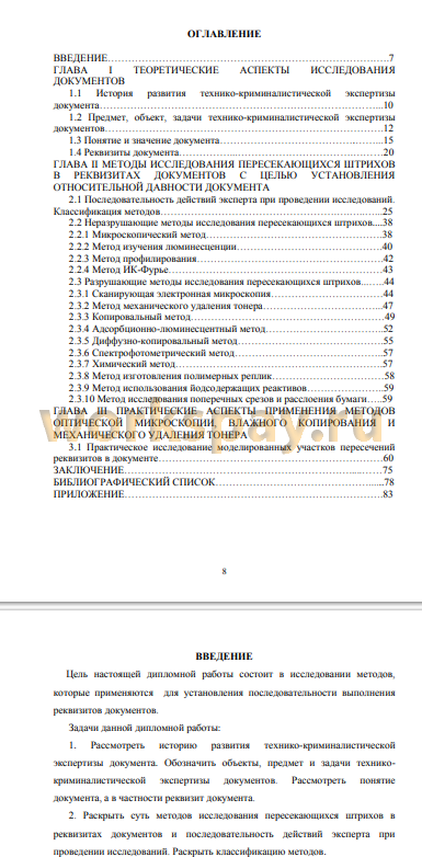 Несмотря на то, что век цифровых технологий успешно развивается, мы не перестаем использовать в повседневной жизни документы, выполненные на бумажных носителях. При большой востребованности данных документов, таких как: паспорта, полиса медицинского и автотранспортного страхования, завещания, ведомости и т. д., имеется опасность их подлога. В связи с преступными деяниями, направленными на подлог документов возникает потребность в проведении судебной экспертизы. Судебная экспертиза имеет специальный вид исследования документов - это техникокриминалистическая экспертиза документов. Данный вид судебной экспертизы занимается исследованием полного и частичного подлога документов. При исследовании документов необходимо применять большой комплекс средств и методов, которые способствуют решению поставленных перед экспертом вопросов. Применение методов исследования пересекающихся штрихов в реквизитах документов просто необходимо для установления относительной или абсолютной давности документа, что является одной из задач технико-криминалистической экспертизы документов. Данная дипломная работа посвящена методам исследования реквизитов в документе, а именно пересекающимся штрихам реквизитов документов с целью установления относительной давности или последовательности выполнения реквизитов документов. Также дипломная работа содержит практическое исследование пересекающихся штрихов реквизитов в документе, выполненных на лазерном принтере, рукописным способом при помощи «шариковой» и «гелевой» ручек, а также оттиском печати. Цель практического исследования - показать возможности применяемых методов, а именно оптической микроскопии, метода механического удаления тонера и метода влажного копирования, их особенности, достоинства и недостатки.