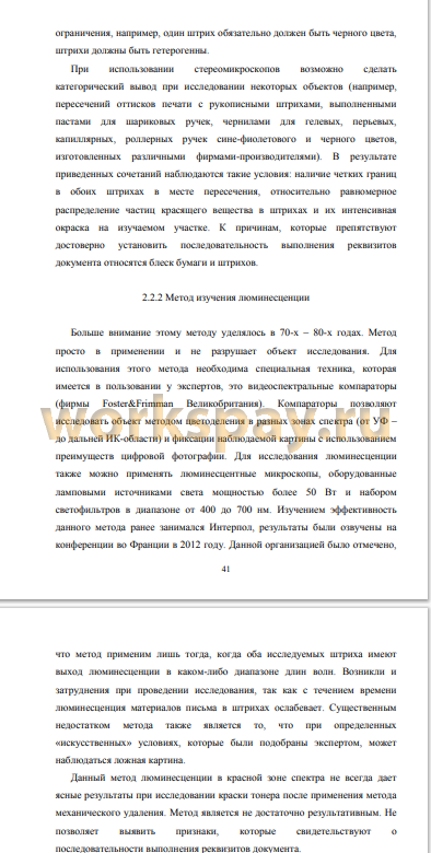 Однако экспертами применяются в большинстве случаев «традиционные» методы т.к. они являются простыми в своем исполнении и менее дорогостоящими. Самыми распространенными методами исследования пересекающихся штрихов являются: метод оптической микроскопии, метод цветоделения в сочетании с оптической микроскопией в косонаправленном освещении, метод механического удаления тонера, диффузно-копировальный метод, метод влажного копирования на пленку ПВХ и адсорбционнолюминесцентный метод.