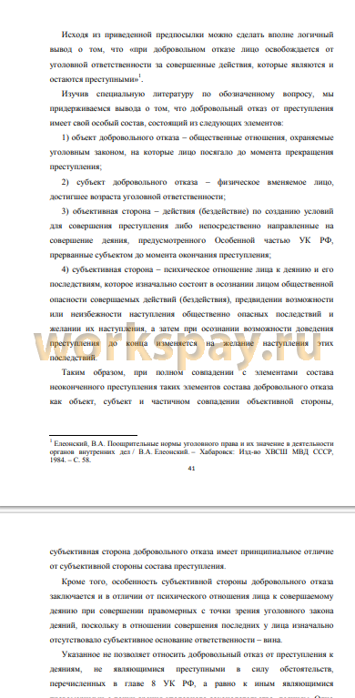 Также мы придерживаемся пусть и не бесспорной точки зрения о том, что в случае добровольного отказа в деянии лица отсутствует состав преступления. Тем не менее, при добровольном отказе от преступления основание прекращения уголовного дела не должно сводиться лишь к отсутствию состава преступления, а должно быть особо закреплено в уголовно процессуальном законодательстве, чтобы подчеркнуть специальное основание не привлечения к уголовной ответственности - добровольный отказ.