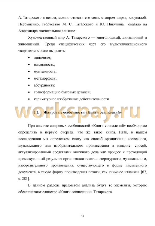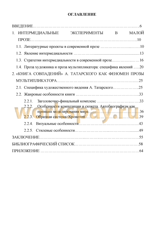 Структура работы. Работа состоит из Введения, двух Глав, Заключения и Библиографического списка. Общий объем работы — 74 страницы. Библиографический список содержит 73 наименования. В первой Главе рассматриваются литературные проекты в современной прозе, проводится анализ научных работ, посвящённых исследованию явлению интермедиальности, сопоставляются понятия прозы художника и прозы мультипликатора. Во второй Главе мы рассматриваем «Книгу совпадений» А. Татарского как феномен прозы мультипликатора, выявляем специфику творческого метода автора и анализируем книгу на разных уровнях организации текста. В Заключении подводятся итоги работы.