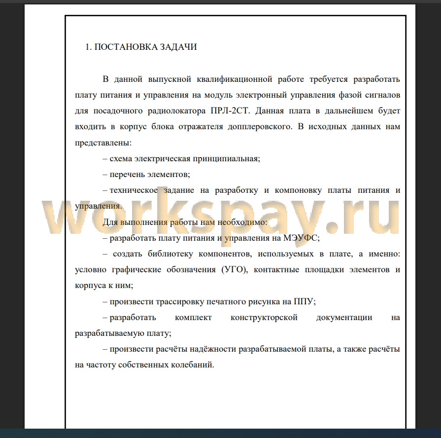 Целью данной выпускной квалификационной является разработка платы питания и управления на модуль электронный управления фазой сигналов (МЭУФ) посадочного радиолокатора ПРЛ-2СТ. Этот радиолокатор входит в состав стационарной радиолокационной системы посадки РСП-2СТ.