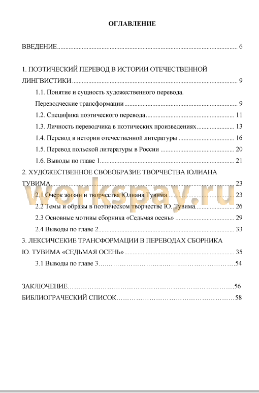 Структура работы обусловлена решением поставленных в ней задач. Исследование состоит из введения, трёх глав, заключения и библиографического списка. Первая глава посвящена рассмотрению перевода как феномена в истории отечественной лингвистики. Во второй главе рассмотрены особенности поэзии Ю. Тувима в контексте жизни и творчества автора, проанализированы основные мотивы и образы сборника «Седьмая осень». Третья глава посвящена определению переводческих трансформаций в стихотворениях из обозначенного сборника.