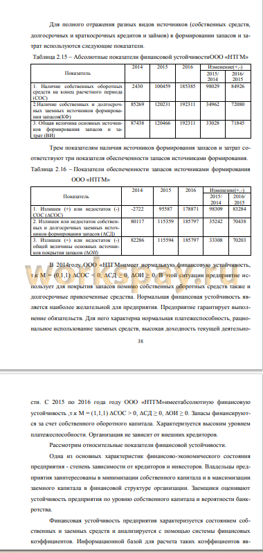 С 2015 по 2016 года году ООО «НТГМ»имеетабсолютную финансовую устойчивость. Запасы финансируются за счет собственного оборотного капитала. Характеризуется высоким уровнем платежеспособности. Организация не зависит от внешних кредиторов.