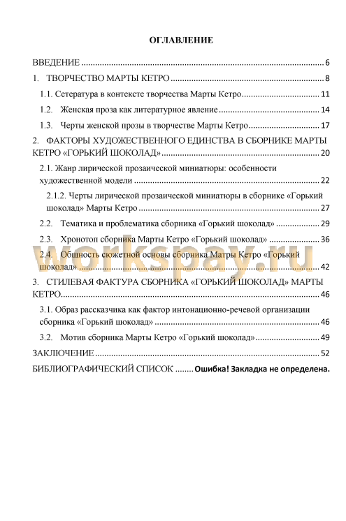 Наша работа состоит из Введения, трёх глав, Заключения и Библиографического списка. Первая глава посвящена обзору художественно мира Марты Кетро и характеристике ее произведений в контексте женской прозы. Вторая глава посвящена определению факторов художественного единства сборника «Горький шоколад» Марты Кетро, включает в себя анализ поэтики данного произведения, с точки зрения функционирования в нем носителей жанра, определяющих механизмы формирования художественного единства. В третьей главе рассматривается стилевая фактура сборника «Горький шоколад», которая включает в себя анализ образов и ассоциативного фона.