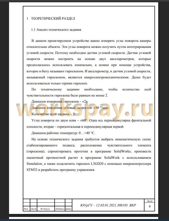 В данной выпускной квалификационной работе проектируется SD-модель собственного стабилизированного подвеса камеры. Проектирование будет производиться для определенной модели смартфона. В дальнейшем можно будет изменить подвес (сделать его не для конкретного смартфона, а, например, для камеры) и использовать на производстве при видеозаписи документов и т.д.