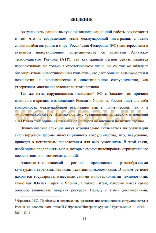 сотрудничества», Сафроновой Е.И. «Основные форматы многостороннего взаимодействия в Азиатско-Тихоокеанском Регионе» и Киреевой А.А. «Отношения России со странами Восточной Азии: новые вызовы и возможности», в которых раскрываются все важные аспекты поставленного передо мной вопроса. В работах этих авторов подробно говорится о взаимодействии Российской Федерации со странами АТР, а также о поступающих в эти страны инвестициях. В статье Фроловой Н.С. не только обсуждаются проблемы развития инвестиционного сотрудничества, но и перспективы.