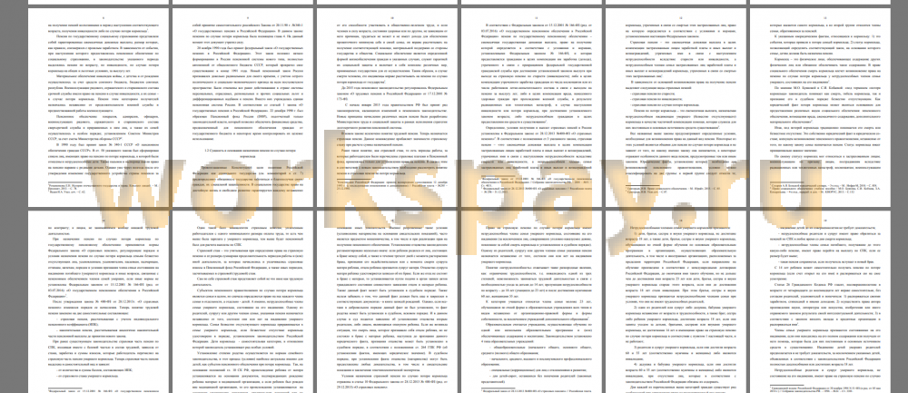 Теоретической, нормативной и практической базой работы являются Конституция Российской Федерации, Федеральный Закон «О страховых пенсиях», Федеральный закон «О государственном пенсионном обеспечении в Российской Федерации», «О пенсионном обеспечении лиц, проходивших военную службу в органах внутренних дел, государственной противопожарной службе, органах по контролю за оборотом наркотических средств и психотропных веществ, учреждениях и органах уголовноисполнительной системы, Федеральной службе войск национальной гвардии РФ, и их семей», «О социальной защите граждан, подвергшихся воздействию радиации вследствие катастрофы на Чернобыльской АЭС», Семейный Кодекс Российской Федерации, Гражданский Кодекс Российской Федерации, Гражданско-процессуальный Кодекс Российской Федерации, официальные материалы органов исполнительной власти - Министерства юстиции, нормативно-правовые акты региональных органов, материалы судебной практики Верховного суда.