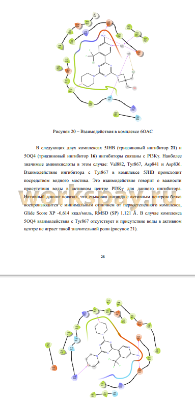 • На основе полученных данных были найдены соединения-лидеры для трех изоформ PI3K: PI3Ka, PI3Ky, PI3K5. Так для изоформы PI3Ka это стали 4-пиридин замещенные соединения 27 и 41 (комплекс 5XGI). Для изоформы PI3Ky лидирующие позиции заняли: бисморфолиновое соединение 26 и соединение 29 (комплекс 5JHB). Для комплекса 5OQ4, который также содержит изоформу PI3Ky, биспорролидиновое соединение 49 и соединение 33 стали лидерами, но соединение 26 имеет схожее значение скоринговой функции как для комплекса 5JHB, так и для комплекса 5OQ4. Для изоформы PI3K5 лидирующие позиции заняли соединения 41 и 49 (комплекс 5UBT).