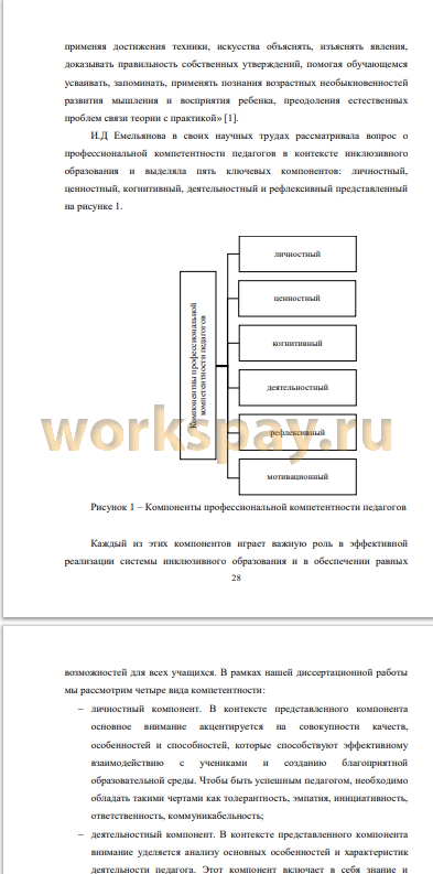 С точки зрения анализа профессионального стандарта педагога в системе инклюзивного образования, можно выделить следующие компоненты профессиональной компетентности педагогов: личностный компонент; ценностный компонент; когнитивный компонент; деятельностный компонент; рефлексивный компонент; мотивационный компонент.