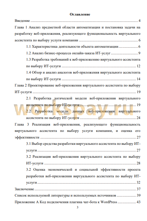 Первая глава посвящена анализу предметной области автоматизации и постановке задачи на разработку веб-приложения, реализующего функциональность виртуального ассистента по выбору услуги компании. Вторая глава посвящена проектированию веб-приложения. В третьей главе описан процесс реализации и оценки эффективности предлагаемых проектных решений.
