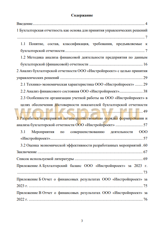 Работа состоит из трех разделов. Первая часть исследует теоретические основы формирования и анализа бухгалтерской отчетности. Вторая часть работы посвящена анализу бухгалтерской отчетности анализируемого предприятия с целью информационного обеспечения управленческих решений в ООО «Инстройпроект». В третьем разделе произведена разработка мероприятий по совершенствованию порядка формирования и анализа отчетности для предприятия.