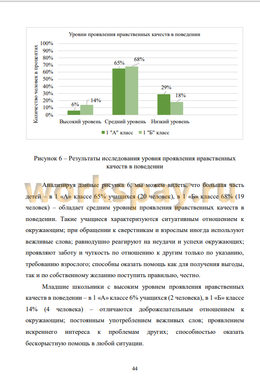 Сопоставив результаты первичной и повторной диагностики по всем методикам, было обнаружено, что в экспериментальной группе (1 «А» класс) количество детей с высоким уровнем развития нравственных качеств увеличилось на 9%, средним уровнем - на 4%, что снизило на 13% число учащихся с низким уровнем развития нравственных качеств, то есть у 68