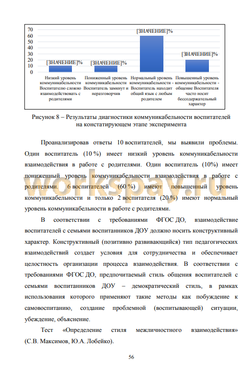 4. Анализ результатов констатирующего этапа эксперимента, полученных при проведении диагностика уровня готовности воспитателей к сотрудничеству с семьями воспитанников и изучению особенностей методической работы по ее формированию позволил выделить ряд проблем воспитателей: недостаточное знание методов, приемов, форм и технологий, обеспечивающих реализацию сотрудничества с родителями воспитанников; а также слабые знания и умения по планированию работы по сотрудничеству с родителями, недостаточный уровень коммуникабельности отдельных воспитателей, проявление директивного и попустительского стилей общения; слабое умение обобщать и использовать передовой опыт; отсутствие навыков и другие. Это подтвердило необходимость проведения более эффективной методической работы по формированию готовности воспитателей к сотрудничеству с семьями воспитанников ДОО,