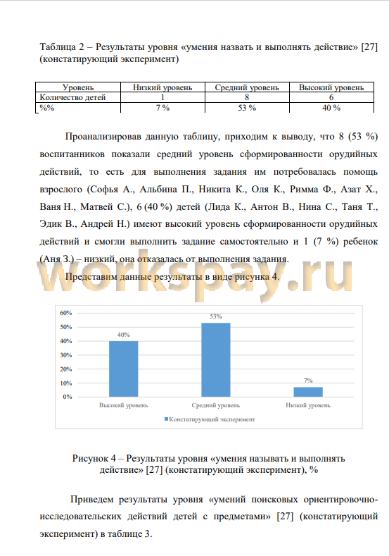 На контрольном этапе было установлено, что у детей повысился уровень сформированности предметных действий: так детей с низким уровнем стало меньше на 14 % и составил 17 %, средний - остался на прежнем уровне 50 %, а высокий поднялся на 14 % и составил 47 % детей, что обусловлено проведением серии занятий, направленных на совершенствование указанного навыка. Количественный анализ показывает, что примененная и описанная в разделе 2.2 система работы, положительно влияет на развитие предметной деятельности дошкольника.