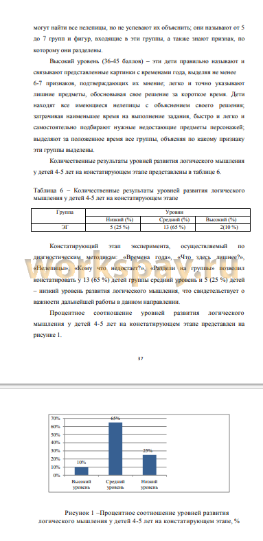 На констатирующем этапе эксперимента, посредством пяти методик у детей 4-5 лет было зафиксировано преобладание низкого и среднего уровней развития логического мышления, что и сориентировало нас на осуществление дальнейшей работы по ее развитию.