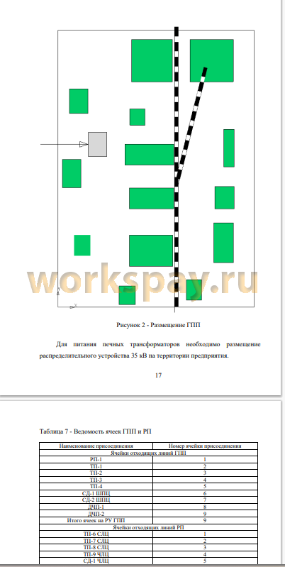 Определено расчетное значение координат центра электрических нагрузок предприятия. Однако расчетные координаты ЦЭН попадают на территорию кузнечно-прессового цеха. Так как в цехе невозможно размещение главной понизительной подстанции предприятия (Г1111), то место размещения ГНИ сносится в сторону линии от подстанции энергосистемы. Проектом предложено, высоковольтных потребителей шаропрокатного цеха запитать напрямую с шин ГПП, так как данный цех расположен в непосредственной близости от ГПП. Питание высоковольтных приемников сталелитейного и чугунолитейного цехов, из-за их удаления от места размещения ГПП, предлагается выполнить от распределительного пункта (РП), который предлагается разместить около данных цехов. Эти решения позволят уменьшить число отходящих от ГПП линий.