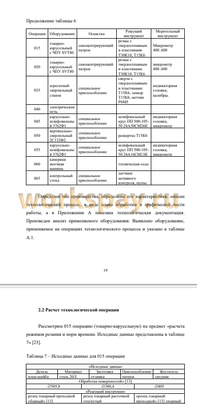 Определен тип производства, определены его характеристики, описан технологический процесс, в виде плана обработки в графической части работы. Произведен анализ применяемого оборудования. Выявлено оборудование, применяемое на операциях технологического процесса. Проведен анализ оборудования на предмет его соответствия типу производства. Произведен анализ применяемых приспособлений. Выявлены станочные приспособления, применяемые на операциях технологического процесса. Проведен анализ приспособлений на предмет их соответствия типу производства. Выявлены приспособления, не обеспечивающие требуемые характеристики качества обработки и производительность. Произведен анализ применяемого режущего инструмента. Произведен анализ режимов резания. Показаны режимы резания и нормы времени на лимитирующей операции 015 токарно-карусельной. Произведен анализ контрольных операций. Сделаны выводы и предложения по усовершенствованию технологического процесса. Разработаны мероприятия по обеспечению безопасности и экологичности технического объекта исследования. Показана экономическая эффективность.